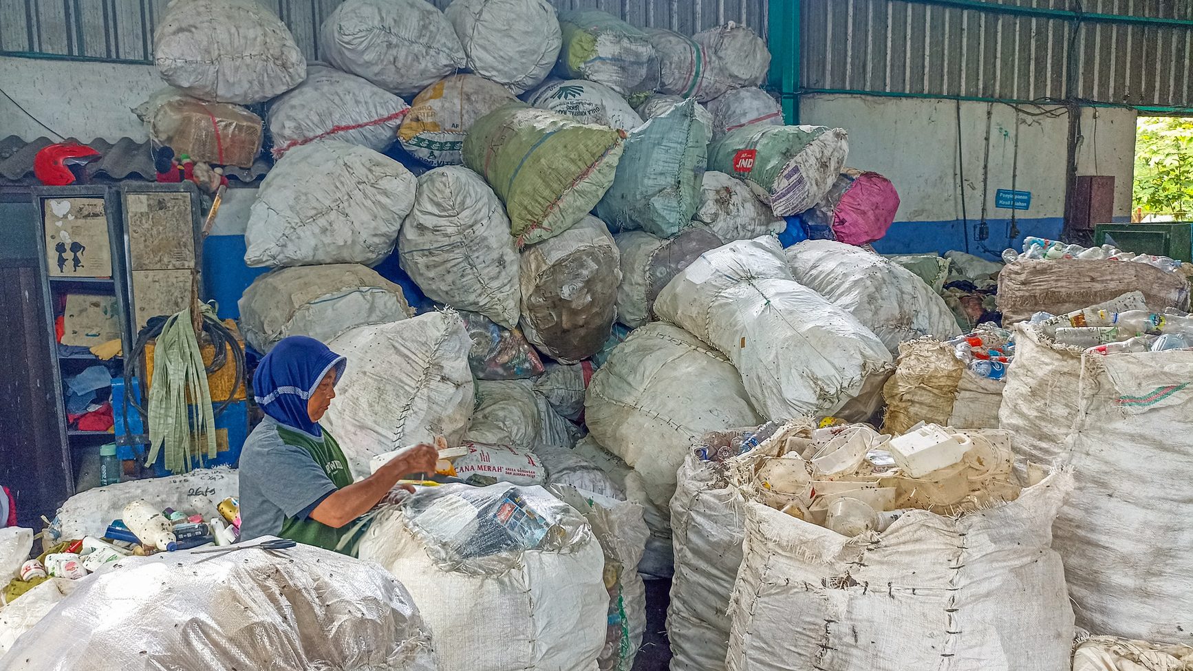 Empat keranjang setinggi dua meter penuh plastik sekali pakai menanti dipilah. Salah satu pekerja perempuan memisahkan tiap jenis plastik dengan cepat. Gunungan plastik itu harus tuntas sebelum jam kerja berakhir.